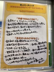 今回の認知症本人ミーティングでは「認知症疾患医療センターにいただいたもの忘れお便り~みんなだったらどうする?~」をしました。頼れる家族が病気になってしまい頼れなくなり、「今後誰を頼ればいいのか」「施設に入所した方がいいのか」「家はどうしたらいいのか」と不安を抱えているお便りをもとにミーティングしました。「むずかしい。どうしたらいいんだろう」「私も不安は毎日あります。他人事じゃないと思う」「私は一人だから死んだら誰もわからない」「私はいつ死んでもいいと思っている」「兄弟がいるから何とかなるんじゃないかな」「家があるからお金の苦労がないのはいいことです」「お金があるから食べてはいける」「今のうちに友達を作っておいて頼るようにする」「ケアマネージャーを頼る」「包括支援センターに相談する」「自分一人で腹のなかで決める」「もし同じ立場になったら施設もいいけど、お金がかかるから人を頼って生活していきたい」「ここのサークルに来たら先生がいる」「今のうちにお墓のことまで考えておく」と語られました。今回もメンバーさん同士の意見交換がとても活発であり、同じ悩みを抱えているメンバー同士悩みや想いを分かち合いました。次回2月のサークルも参加お待ちしております。